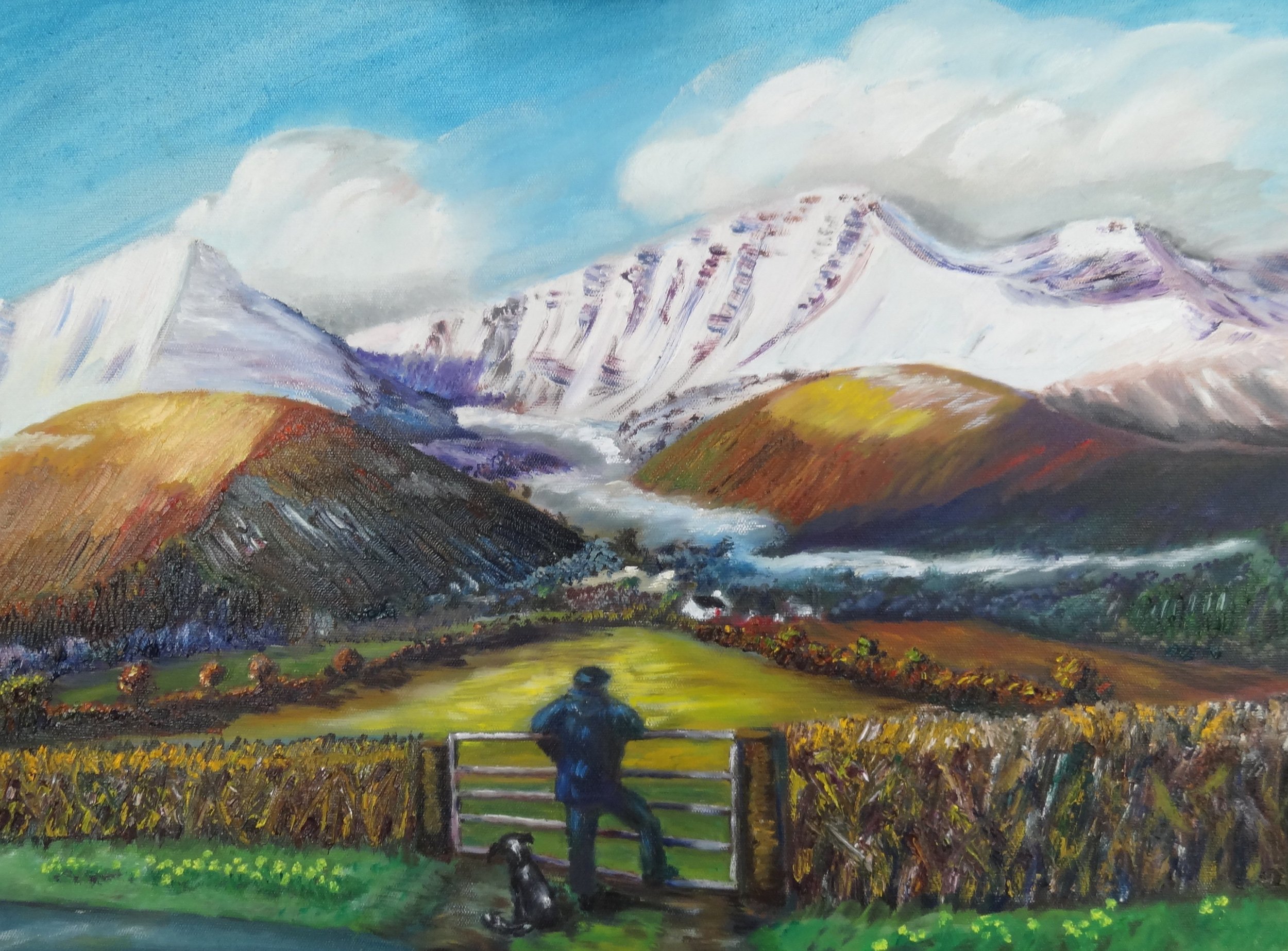 Showing the view from Cantref, looking up at the Brecon Beacons’ peaks (Bannau Brecheiniog), Pen y Fan, Cribyn and Corn Du